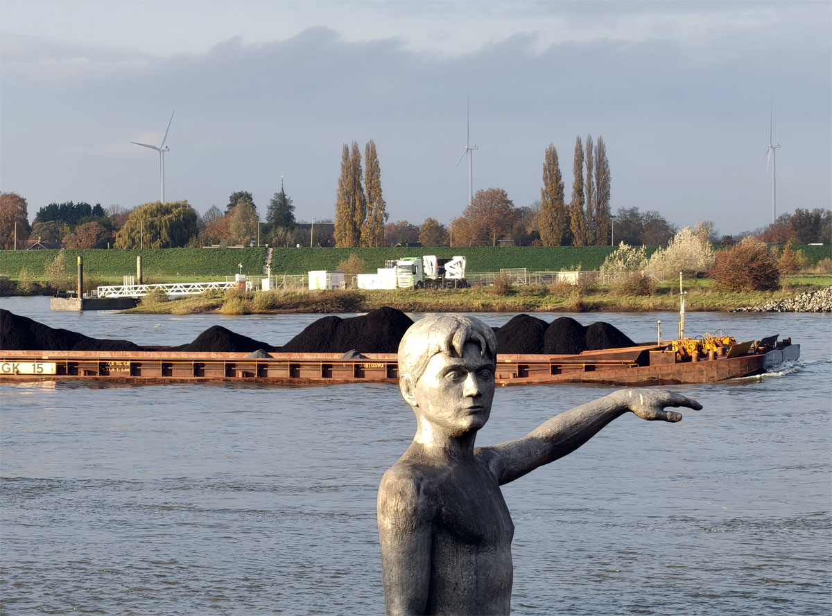 Waterjongen van Marcel Smink wijst aan hoe hoog de waterkering is die
