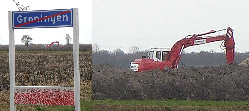 2. Het zuidwesten van Groningen biedt ons, stadsrandliefhebbers, meteen al het volle pond, met naargeestige nieuwbouwwijken, begrensd door landwegen, en zonder blijvend vrij uitzicht op het natuurgebied ‘De Eelder- en Peizermaden’. Die ‘maden’, volgens de onder geletterden onvermijdelijke etymologische discussies, zijn dan natuurlijk geen wormen, al zullen die er ook wel rondkruipen, maar zijn verwant aan ‘meadows’ (weilanden). In het westen en zuiden zit de stad Groningen klem tegen de provincie Drenthe, die verdere uitbreiding slechts mondjesmaat toestaat. Toch heeft Groningen, gezien deze beelden van een dragline, weer een strookje van zijn buren weten af te knabbelen. Dit bord zal nog wel eens verplaatst worden; weg met de meadows! |