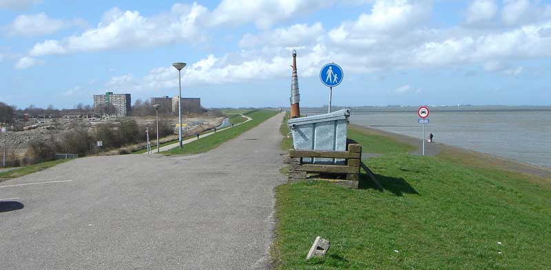 ´s Anderendaags begaven we ons naar Slochteren en Appingedam, waarvan al verslag is gedaan op deze site. Met het Noordnet-boemeltje belandden we vervolgens in Delfzijl. Waar Slochteren en Appingedam zoiets zijn als het eind van de wereld, is Delfzijl een nieuw begin. Het mag dan een plaats zijn met een hartverscheurend lelijk en alledaags centrum, met een achteruit boerende haven, met verloederde, ontvolkte buitenwijken, met een falend stadsbestuur - zoals een autochtoon ons ongevraagd uitlegde toen wij een kopje koffie dronken in het restaurant dat op poten in de Eems staat; Delfzijl opent toch vergezichten op een andere wereld, al is het dan maar het Duitse Oost-Friesland dat aan de overkant ligt.