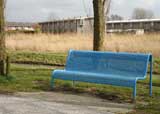 16. De huizen van Mooiland (welja!), Zonland en Waterland in de wijk Lewenborg staan te vloeken met het groen aan de andere kant van Elema’s pad; dat afgrijselijke blauwe bankje staat te vloeken met alles en iedereen. |