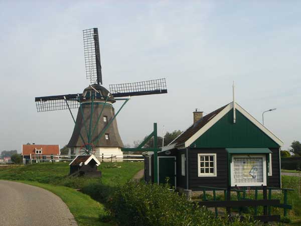 En ik zie, ten noorden van het dorp, de molen De Oude Knegt, die eigenlijk een jonge knecht is. De vorige knecht brandde in de nieuwjaarsnacht van 2001, dezelfde nacht als ‘Volendam’, tot de grond toe af door vuurwerk. Ook die afgebrande molen was een replica van een echte oude. De molen is een paar jaar geleden helemaal opnieuw opgebouwd, in de oude stijl en niet van echt te onderscheiden.