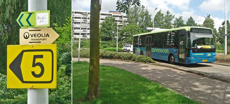 Maar dit is duidelijk een Connexxionbus. Die rijdt vier weken lang een omleidingsroute. In verband met een ingrijpende wegreconstructie is lijn 45 ingekort tot Leiden Centraal. Daar kun je overstappen op een pendelbus van Connexxion, die met een omweg koers zet naar de Merenwijk om daar zijn rondje te rijden. Lijn 45 van Veolia rijdt in kwartierdienst, en het is dan ook logisch dat de pendelbus elke 20 minuten rijdt; dat sluit dan iedere keer lekker aan.