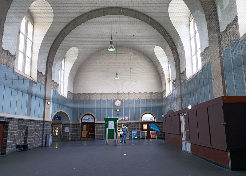 heel lange en brede stationshal vindt de reiziger, naast de eet,- en