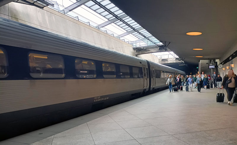 Ik heb het allemaal al heel lang van te voren op- en uitgezocht, maar vandaag ga ik het echt meemaken. Uit Odense neem ik de trein van 8:53 naar station København Lufthavn. Ook vandaag is deze trein weer overvol. Vrijwel alle stoelen zijn gereserveerd, maar ik zit op de plek van iemand die van Fredericia naar Kopenhagen had gewild, en niet is komen opdagen. Hopelijk niets ernstigs gebeurd…