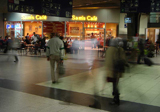 ‘Non, non, breudzjes fienieshed!’, gaf men mij te verstaan bij Sam’s Café in de hal van Brussel Centraal, in het drietalig koeterwaals waarmee men in Brussel mensen van buiten de stad te woord staat. Dan de ontaarde broodjeswinkel maar gefotografeerd. Fotograferen zonder direct daglicht wordt in principe niks; door de lange sluitertijd ontstaat bewegingsonscherpte. Maar zet je je camera op iets dat als ondergrond dienen kan (in dit geval een kastje met een brandblusser erin) en gebruik je de zelfontspanner, dan wordt alles wat stilstaat, ragscherp, en alles wat haast heeft, raar uitgerekt.