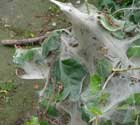 Een luguber gezicht: struiken met een witte sluier en kale bomen in juni. De boosdoeners: rupsen van de spinselmot. (Leiden, Beethovenlaan; 4 juni 2009).
