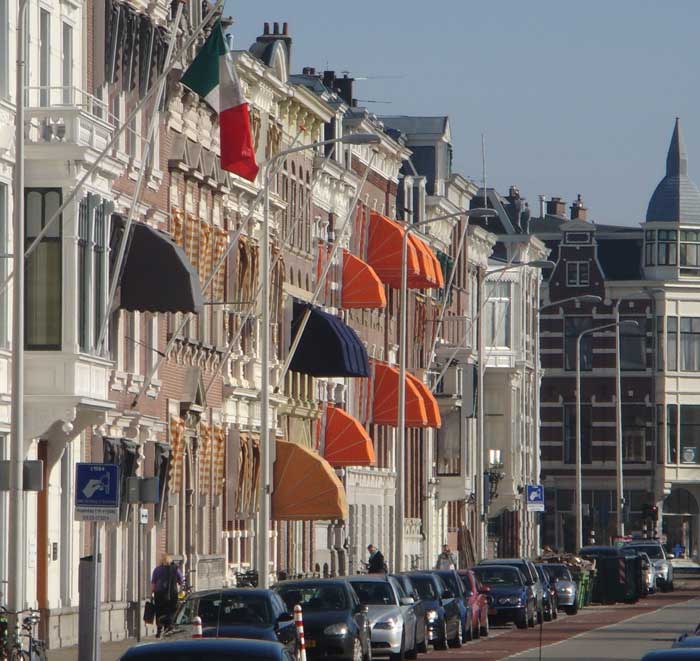 Lente: kleurige zonneschemen op het Haagse Nassauplein. 21 maart 2011.