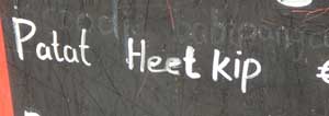 ‘Patat heet kip’, bij een snackbar in het hart van Gouda. Laten we hopen dat kip dan op zijn beurt patat heet, anders wordt de spraakverwarring nog Babylonischer.