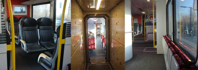 De GTW’s van de Heuvellandlijn verschillen niet spectaculair van die, die ik laatst op de lijn Dordrecht – Geldermalsen zag. Ze worden elektrisch aangedreven, hebben een doorloopmotor, een compartimentje voor fietsen en stoelen in 3+2-opstelling.