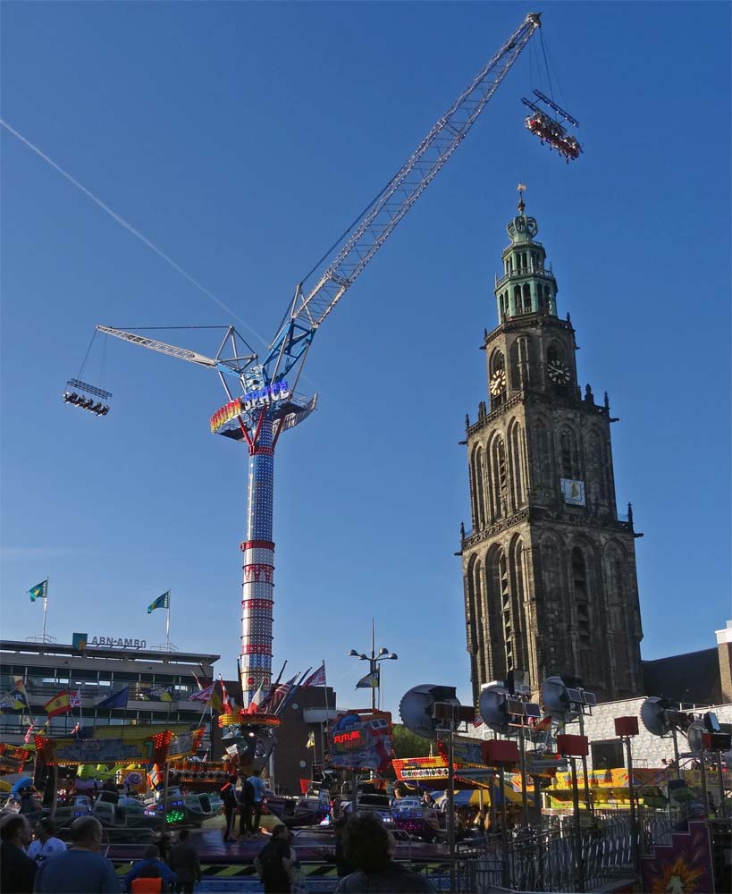 Grote Markt een kermistoestel dat nu eens letterlijk boven Groningen