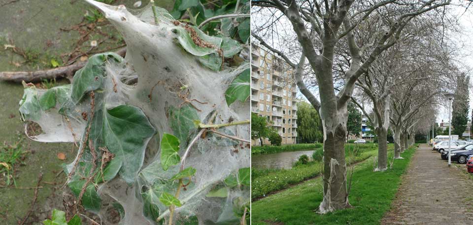 Ik had iets met pleinen dit jaar, merk ik. Dit is heel wat anders. Deze lugubere foto maakte ik op de Beethovenlaan in Leiden. Deze bomen hebben geen afgrijselijke ziekte, maar zijn als woonplaats uitverkoren door de spinselmot. Die vreten eerst alle bladeren op en spinnen de bomen dan geheel in. Het ziet er weerzinwekkend uit, maar het komt allemaal goed. Als de motten uit hun cocon komen, verdwijnt het witte waas en krijgt de boom, midden in de zomer, opnieuw bladeren.