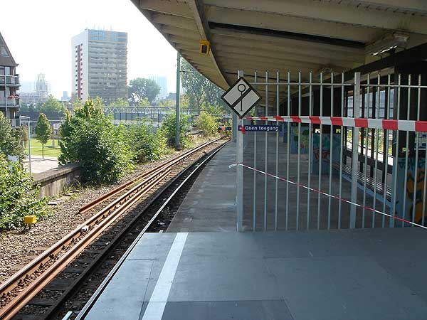 De uitgang richting centrum, over de trappen nabij de Willemstunnel, is afgesloten. De enige toegang tot dit in 2008 op te doeken station is helemaal aan de andere kant, bij de Heer Bokelweg, waar je kunt overstappen op tram 4. RET ziet zijn klanten de rit blijkbaar liever per tram dan te voet vervolgen.