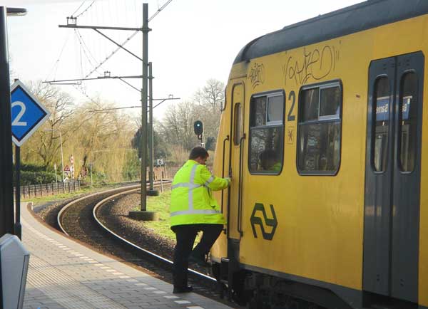 Ook de serie Amersfoort – Ede-Wageningen heeft krappe keertijden. Mede daardoor gaat het (nog) niet gestroomlijnd op de Valleilijn. Vanmiddag zie ik geen enkele trein ook maar bij benadering op tijd rijden. Het is mede te wijten aan het ontbreken van een conducteur. De meester moet bij elk station uit zijn cabine komen, fluiten, ‘sleutelen’ vanaf het perron, en teruglopen naar zijn hok. De onwennigheid straalt er nog vanaf, op dit lijntje waar al 104 jaar treinen rijden (kan het zijn, dat ik een grootscheeps gevierd eeuwfeest gemist heb?)