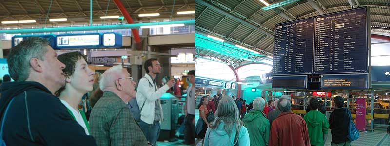 Maar nog niet zijn we in de trein naar Arnhem gezeten, of er wordt omgeroepen dat de politie met de hand over het hart heeft gestreken, en het treinverkeer richting Amersfoort weer op gang mag komen. Terug dus, trap op, trap af. Onze trein is al opgeheven of doorgereden, dus er zit niets anders op dan te wachten op die naar Enschede en in Amersfoort over te stappen op de langzame IC die wel stopt in Meppel, etc. Dit zijn koplopers, met wel gratis WiFi; we verdenken Erica ervan, een valse melding ge-sms’t te hebben naar de politie van Den Dolder.