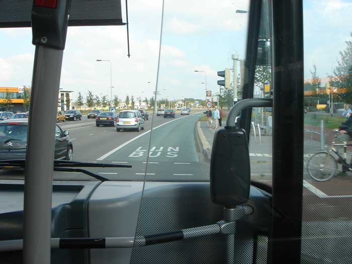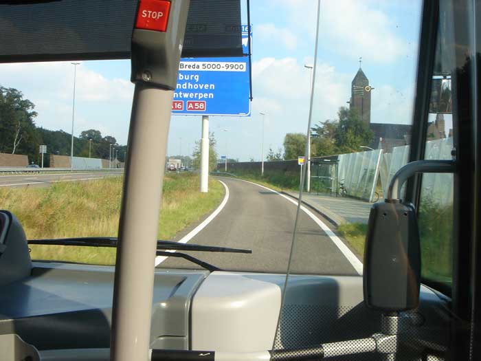 Volans rijdt met mooie, rooie, comfortabele nieuwe bussen. Het valt niet mee, ze te fotograferen in de duistere loods die nog steeds het streekbusstation is van Breda. Eigenlijk zijn die bussen van binnen niet zo verschrikkelijk bijzonder. Wat wel aardig is: die hoge stoel voorin, waarin je een overzicht op de weg hebt alsof je zelf de chauffeur was. Die heb je trouwens in de meeste nieuwe bussen, vliegend of niet. Je kunt op die plaats ideale foto’s maken van de busbaan, zonder de bus te hoeven verlaten. Ik kom op de terugweg pas op dat idee, dus de foto’s zijn in de richting Breda, terwijl het verhaal zich voltrekt in de richting Etten-Leur.