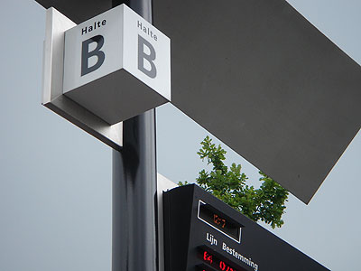 Er is toch enig verschil met de connexxion-bussen in Leiden, merk ik; deze bussen hebben de lichtkrant met halteaanduiding, die bij ons voorlopig behoort tot de nog niet ingeloste beloften. Ik lees de haltenamen: Kampkuiper, Landriteweg, Lutkeberg, Knoefbakker… Het ding loopt niet helemaal synchroon met de werkelijkheid; de haltenaam verspringt pas als we het gele bord al 200 meter voorbij zijn. Volgens mij is het systeem gekoppeld aan de kilometerteller, en wordt het onderweg niet ge-update door sensoren langs de weg, of zoiets. Dat werkt onnauwkeurigheid in de hand; stel dat er plotseling ergens een wegomlegging is; dat komt nooit meer goed.