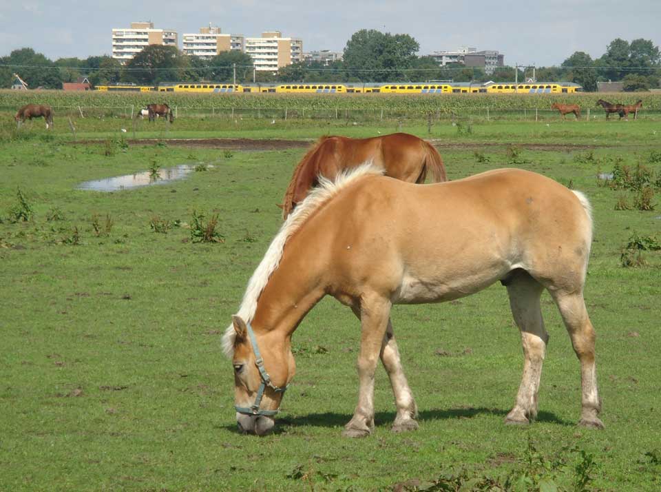 De spoorbaan Uitgeest – Alkmaar doorklieft Heemstede. Twaalf treinen per uur zie je hier passeren. Ik wil er een fotograferen, maar ze hebben nou net allemaal vertraging, en ik sta een dik kwartier te wachten. Dit tot kennelijke ergernis, angst en achterdocht van passerende fietsers die zich afvragen wat ik sta te doen in die berm. Ik groet er een paar, om het ijs te breken, maar houd daar snel mee op, want het helpt niet: hun kakement blijft stijf opeen en hun ogen verraden nog meer argwaan.